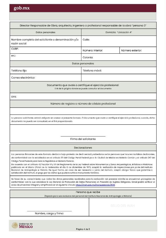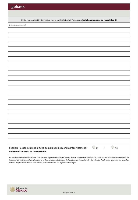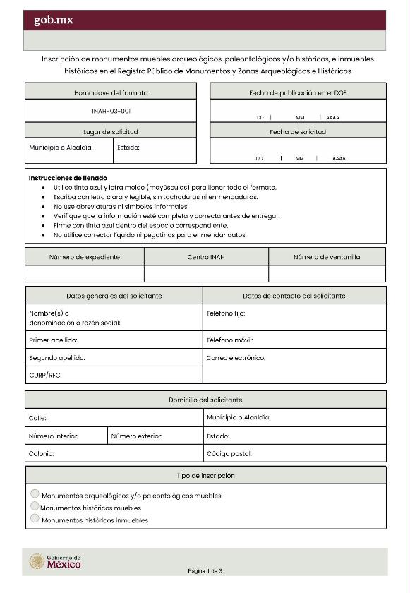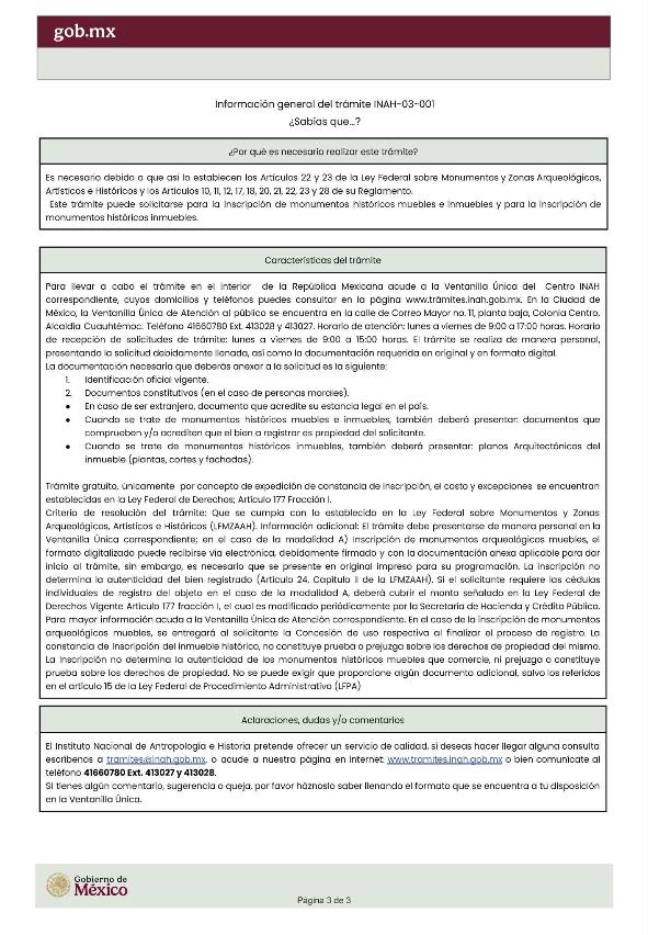 | 3 | INAH-03-001-C | Solicitud para la inscripción de Monumentos Arqueológicos, Históricos y de Comerciantes en Monumentos Históricos; en el Registro Público de Monumentos y Zonas Arqueológicos e Históricos. Modalidad: Inscripción de un monumento histórico inmueble, a petición de parte. | ||
