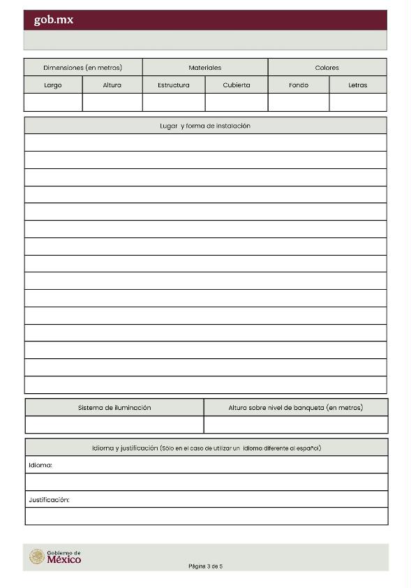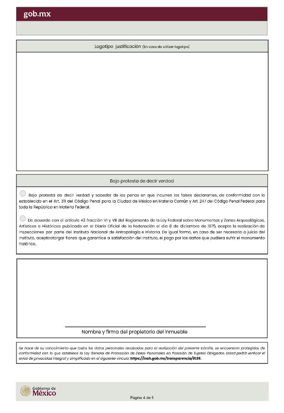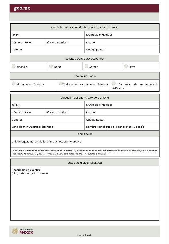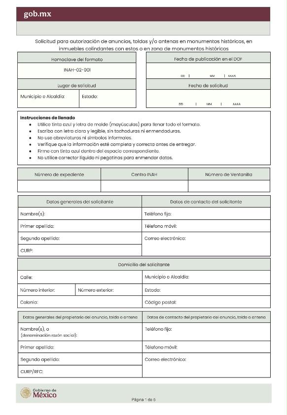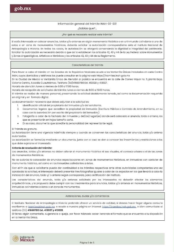 | 2 | INAH-02-001 | Autorización para colocar anuncios, toldos y/o antenas en monumentos históricos, en inmuebles colindantes con éstos o en zonas de monumentos históricos declaradas | 1. Dibujo a escala del diseño del anuncio, toldo o antena. En el caso de anuncio señalar el texto. 2. En los casos de uso de un logotipo y/o idioma distinto al español se debe justificar la razón. |