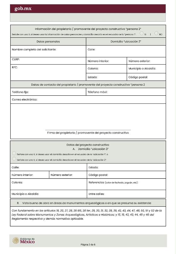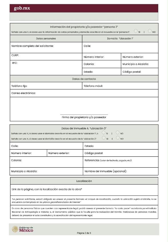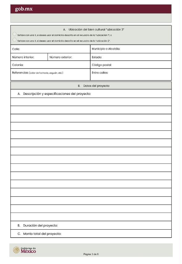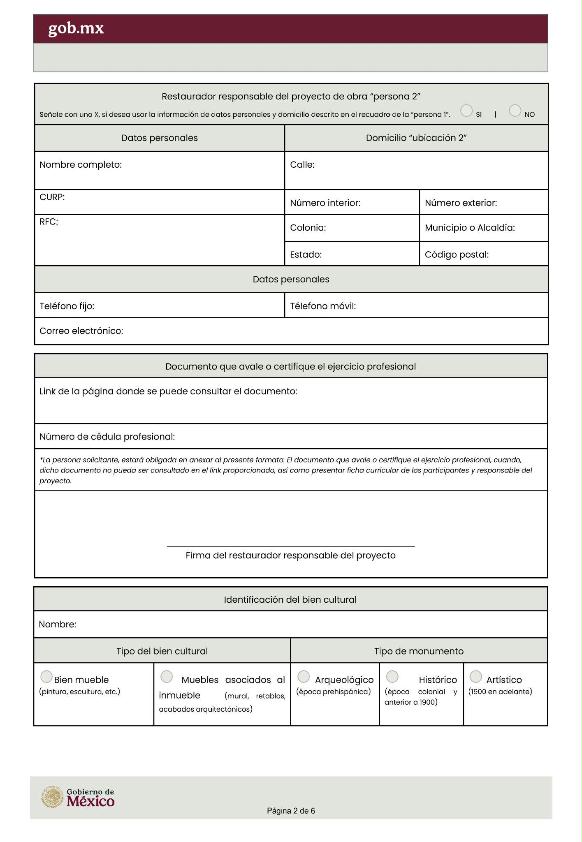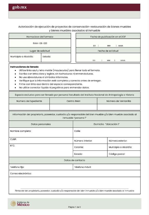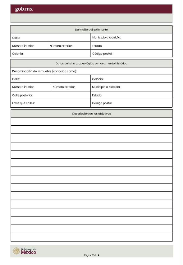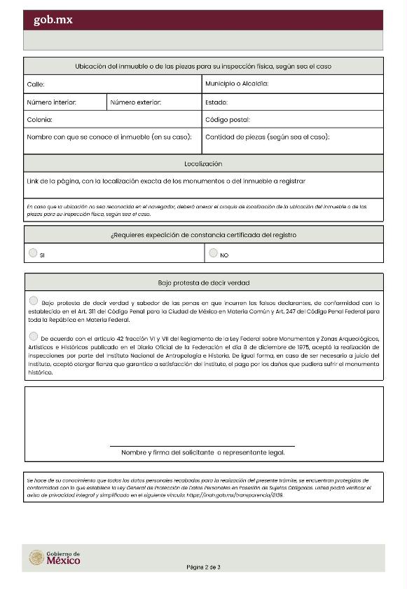 | 2 | INAH-03-001-B | Solicitud para la inscripción de Monumentos Arqueológicos, Históricos y de Comerciantes en Monumentos Históricos, en el Registro Público de Monumentos y Zonas Arqueológicos e Históricos. Modalidad: Inscripción de monumentos históricos muebles. | ||