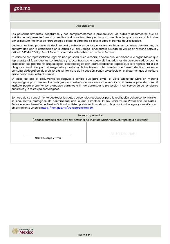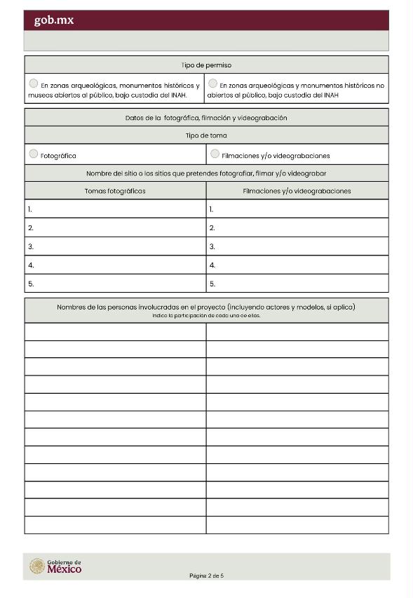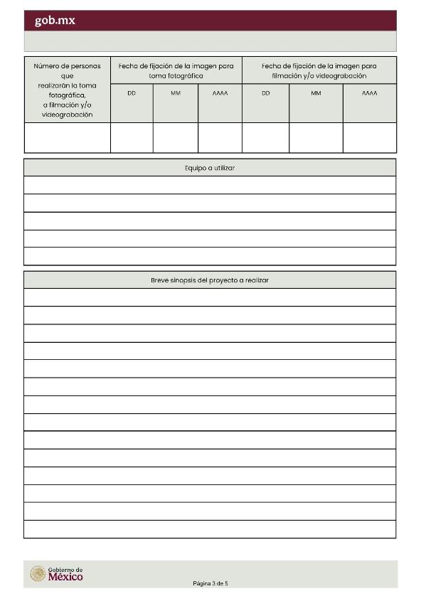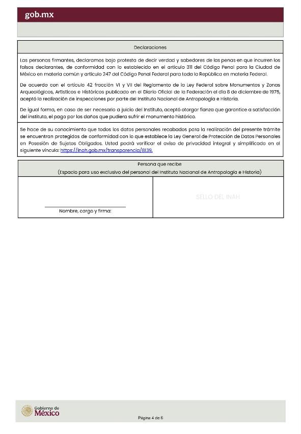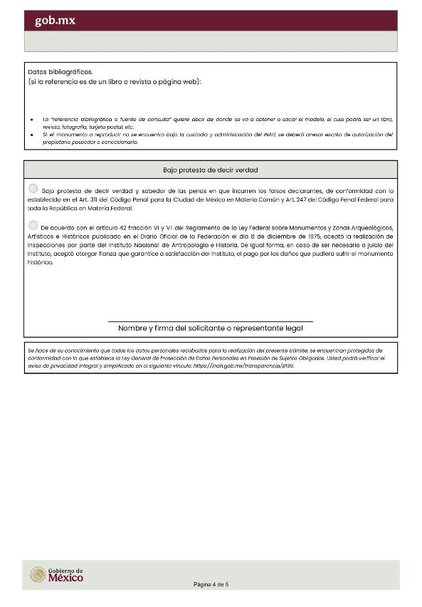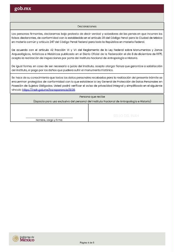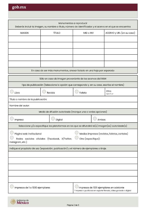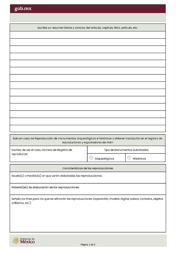 | 6 | INAH-01-004-A | Solicitud de autorización de reproducción de monumentos, imagen proveniente de los acervos del INAH. Imagen proveniente de los acervos del Instituto Nacional de Antropología e Historia. | 1. Guion o sinopsis del uso de la(s) imagen(es). |