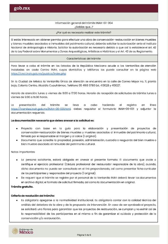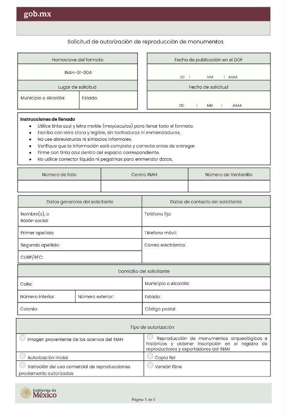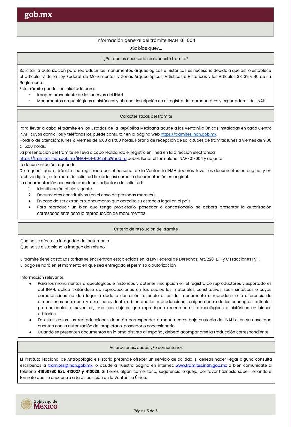 | 5 | INAH-01-004-B | Solicitud de autorización de reproducción de monumentos. Reproducción de monumentos arqueológicos e históricos e inscripción en el registro de reproductores y exportadores del Instituto Nacional de Antropología e Historia (INAH). |