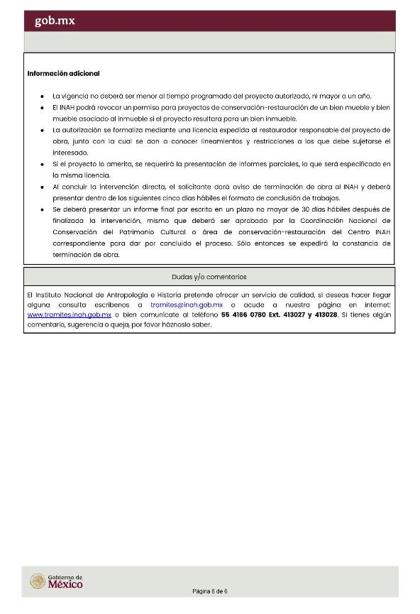 | 4 | INAH-06-001 | Autorización de ejecución de proyectos de conservación-restauración de bienes muebles y bienes muebles asociados al inmueble | 30 días hábiles | 15 días hábiles |