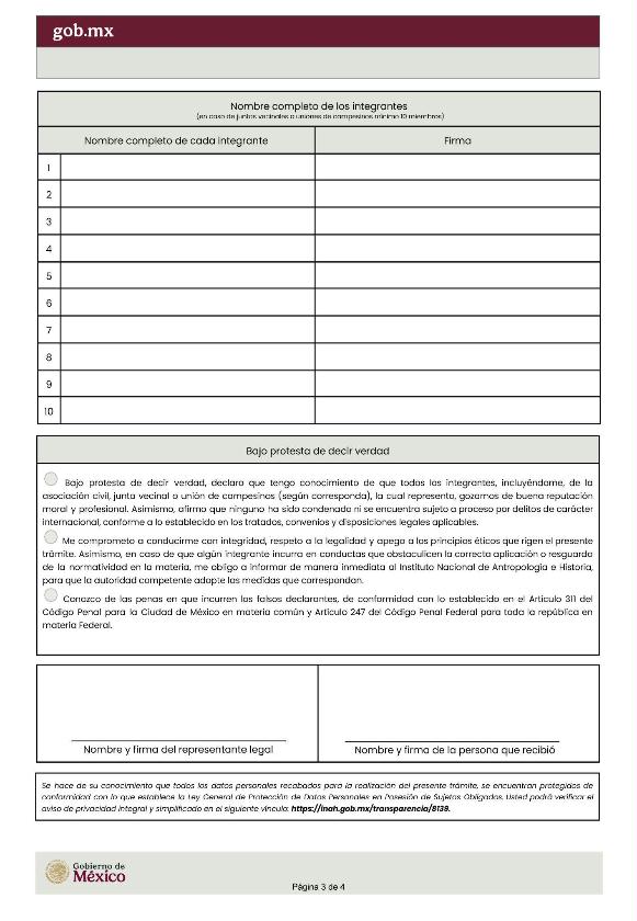 | 1 | INAH-01-003 | Solicitud para el reconocimiento de asociaciones civiles, juntas vecinales y uniones de campesinos, como órganos coadyuvantes del INAH | 1. Carta de no antecedentes penales de cada uno de los integrantes. |