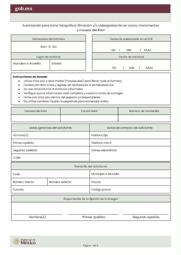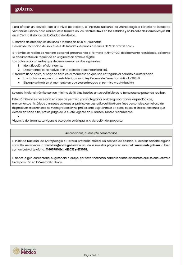 | 4 | INAH-01-001 | Autorización de toma fotográfica, filmación y/o videograbación en zonas, monumentos y museos que utilizan equipo especial y/o profesional | 1. Formato INAH-01-001, "Autorización para toma fotográfica, filmación y/o videograbación en zonas, monumentos y museos del INAH" | 5 días hábiles | 3 días hábiles |