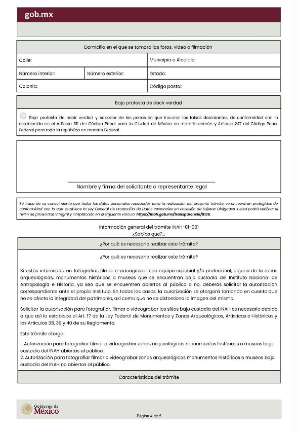 | 6 | INAH-01-001 | Autorización de toma fotográfica, filmación y/o videograbación en zonas, monumentos y museos que utilizan equipo especial y/o profesional | Autorización para toma fotográfica, filmación y/o videograbación en zonas, monumentos y museos del INAH | VI |