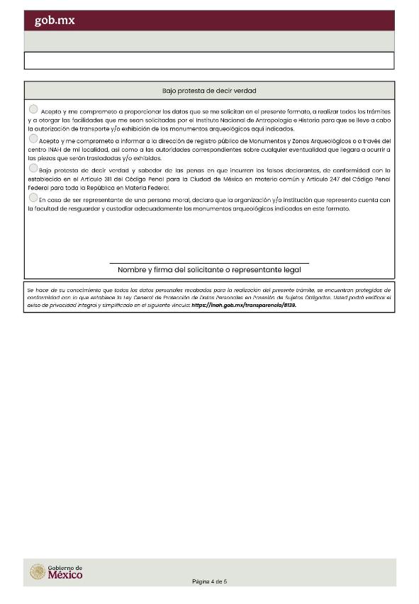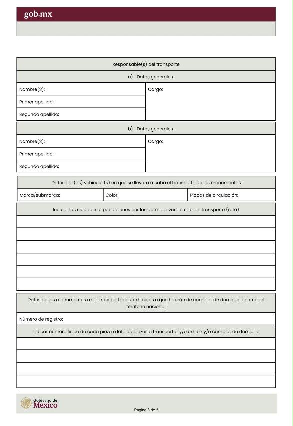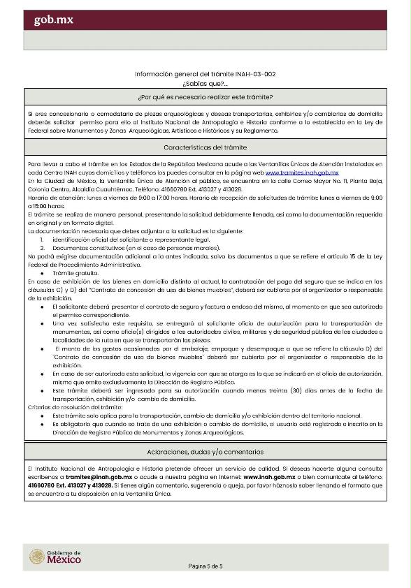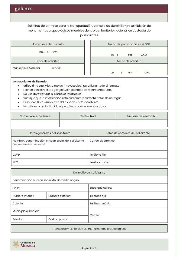 | 5 | INAH-03-002 | Solicitud de permiso para la transportación, cambio de domicilio y/o exhibición de monumentos arqueológicos muebles dentro del territorio nacional en custodia de particulares | Solicitud de permiso para la transportación, cambio de domicilio y/o exhibición de monumentos arqueológicos muebles dentro del territorio nacional en custodia de particulares | V |