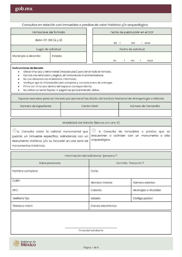 | 1 | INAH-03-001-D | Solicitud para la inscripción de Monumentos Arqueológicos, Históricos y de Comerciantes en Monumentos Históricos, en el Registro Público de Monumentos y Zonas Arqueológicos e Históricos. Registro de comerciantes en monumentos históricos muebles, a petición de parte ante el INAH |