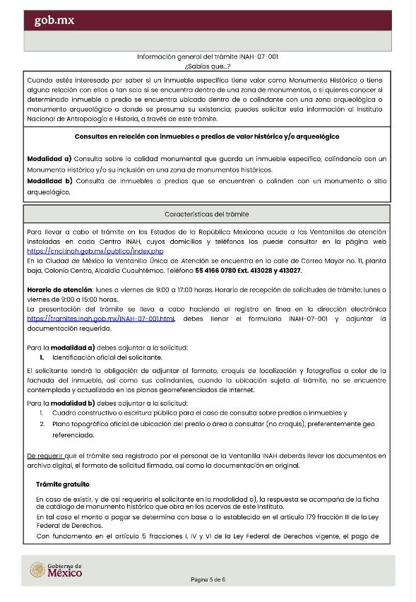 | 7 | INAH-07-001 | Consultas en relación con inmuebles o predios de valor histórico y/o arqueológico, A y B. | Consultas en relación con inmuebles o predios de valor histórico y/o arqueológico | VII |