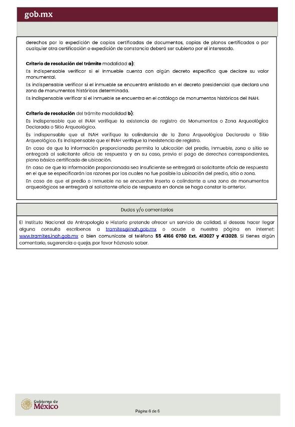 | 1 | INAH-07-001 | Consultas en relación con inmuebles o predios de valor histórico y/o arqueológico - Para consulta sobre la calidad monumental que guarda un inmueble específico, colindancia con un Monumento Histórico y/o su inclusión en una zona de monumentos históricos | 10 días hábiles | 9 días hábiles |