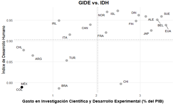 El limitado impacto del conocimiento matemático en el desarrollo social y la soberanía tecnológica del país, estrechamente vinculado a la baja inversión en IDE, constituye una de las situaciones críticas identificadas. México destina apenas el 0.3% de su PIB a IDE, muy por debajo del promedio de los países de la OCDE, que supera el 2.7% (UNESCO y Banco Mundial, 2024). Esta brecha compromete la capacidad nacional para fortalecer la autonomía científica y tecnológica, así como para generar soluciones innovadoras a los grandes desafíos del siglo XXI. Diversos estudios internacionales, como el UNESCO Science Report (2021) y los Main Science and Technology Indicators de la OCDE, muestran una clara correlación entre altos niveles de inversión en ciencia básica y un mayor Índice de Desarrollo Humano (IDH). Esta relación puede observarse en la Gráfica 1, donde los países con mayor gasto en I+D como proporción del PIB presentan también niveles significativamente más altos de desarrollo humano. Aunque la gráfica no distingue por disciplinas, se reconoce que las disciplinas fundamentales, como las matemáticas, son pilares estratégicos para el avance científico, tecnológico y económico de los países, al constituir una base transversal para la generación de conocimiento, la innovación y la toma de decisiones fundamentadas.