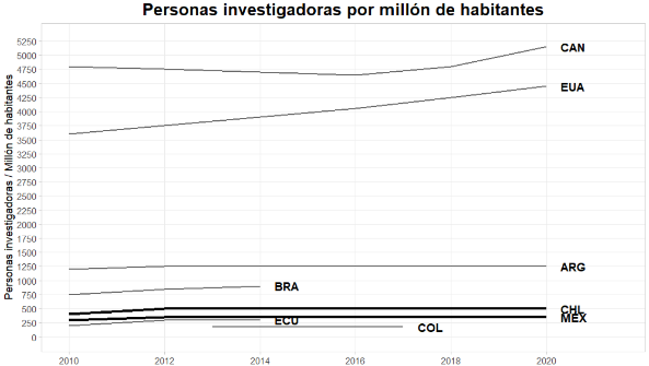 Gráfica 2. Serie de tiempo del número de investigadoras e investigadores por cada millón de habitantes. Fuente: UIS Data Browser UNESCO. Consultado al 5 de junio del 2025.