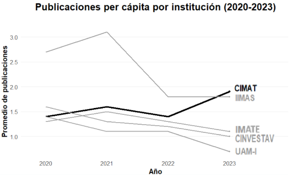 Estas condiciones han derivado en efectos visibles, como el lento avance hacia la soberanía tecnológica y la baja participación de grupos diversos en la construcción del conocimiento matemático. A pesar de este panorama, el CIMAT ha mantenido un desempeño destacado en productividad científica dentro del SNCP. Este desempeño destaca especialmente cuando se analiza la productividad científica per cápita, donde el Centro se posiciona favorablemente respecto a otras instituciones con líneas temáticas similares, en función del número de publicaciones por persona investigadora.