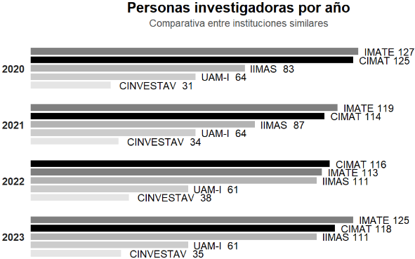 Gráfica 4. Número de investigadoras e investigadores por año en instituciones similares al Cimat. Fuente: Solicitudes de información oficial.