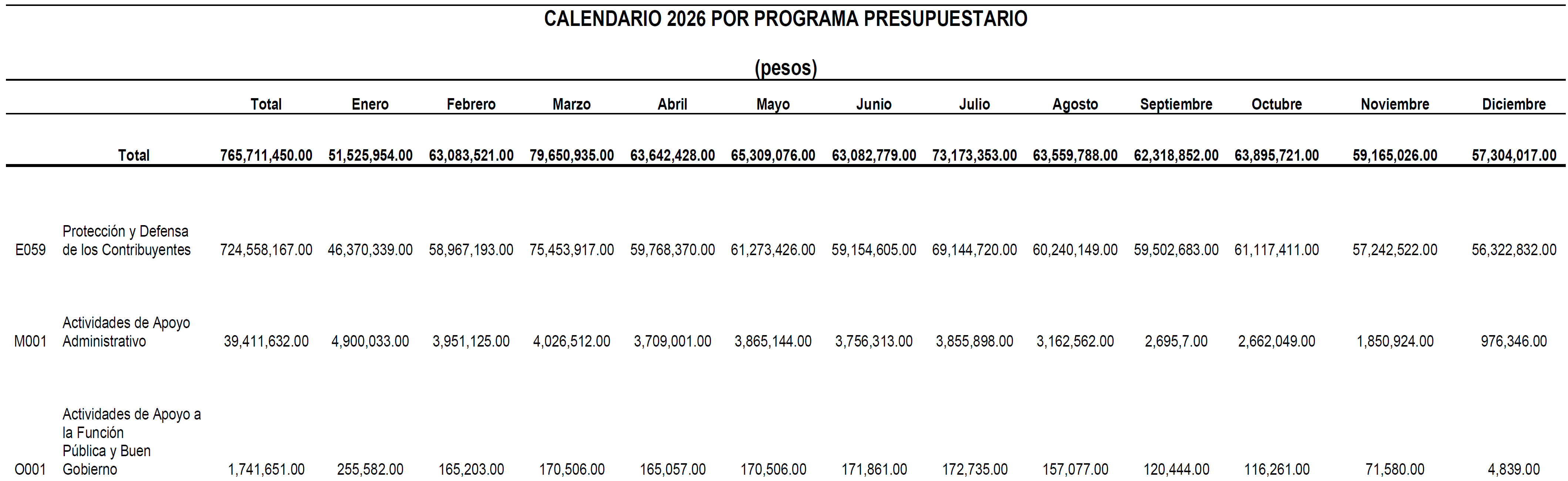 En cumplimiento a lo dispuesto en el párrafo cuarto del artículo 23 de la Ley Federal de Presupuesto y Responsabilidad Hacendaria; 22, fracción IX, inciso b) del Reglamento de la Ley Federal de Presupuesto y Responsabilidad Hacendaria, y conforme al oficio 411/UDPCSG/2025/14311 emitido por la Unidad de Diseño Presupuestario, Control y Seguimiento del gasto, mediante el cual se dan a conocer los Calendarios de presupuesto autorizados para el ejercicio fiscal 2026, me permito comunicar el Calendario de Presupuesto Autorizado por programa presupuestario de la Procuraduría de la Defensa del Contribuyente.