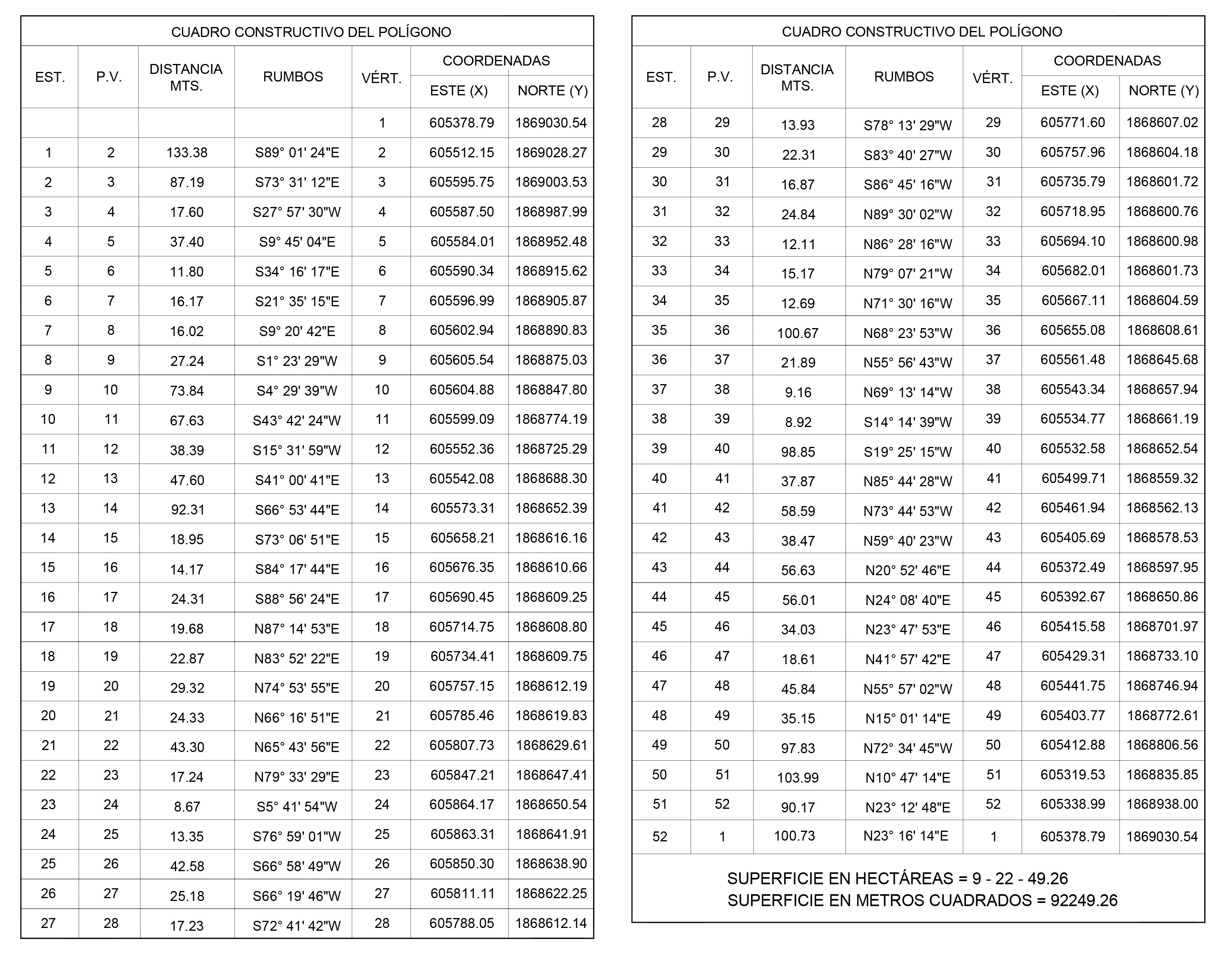 Que, con el Dictamen Técnico, se acredita la necesidad de adquirir el bien inmueble el cual es idóneo para la "Protección, Investigación, Custodia, Conservación y Restauración de la Zona de Monumentos Arqueológicos de Toniná", por lo que el INAH elaboró el plano topográfico del inmueble con superficie de 9-22-49.26 hectáreas (nueve hectáreas, veintidós áreas, cuarenta y nueve punto veintiséis centiáreas) dentro de la poligonal de la Zona de Monumentos Arqueológicos de Toniná, ubicada en el municipio de Ocosingo, estado de Chiapas, en el que se advierten las coordenadas UTM, mismas que se detallan en los siguientes cuadros de construcción: