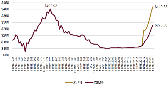 Por ello, a partir del 1° de enero de 2025 los salarios mínimos crecieron en 12.0% en términos nominales, a 419.88 pesos diarios en la ZLFN y a 278.80 pesos diarios en la ZSMG (antes resto del país), cantidades que se encaminan a garantizar la calidad de vida de una familia mexicana. De tal manera que, a octubre de 2025 se ha tenido una recuperación del poder adquisitivo del salario mínimo de 245.5% en la ZLFN y de 129.4% en la ZSMG si se compara con el cierre del 2018.