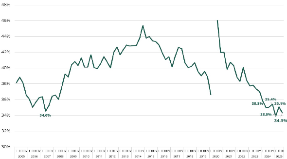 Gráfica 2. Tasa de pobreza laboral, 2005-2025