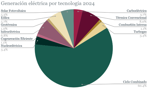 14 La rebanada color verde, que por la escala no se etiqueta; corresponde a bioenergía, que representó un 0.19% en 2018, y un 0.15%en 2024.