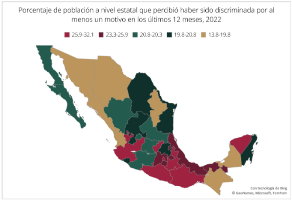 Esta realidad se manifiesta de forma heterogénea a lo largo del territorio nacional. De acuerdo con la ENADIS 2022, los estados con los mayores porcentajes de población de 18 años y más que manifestó haber sido discriminada son Yucatán (32.1%), Puebla (30.6%), Querétaro (30.5%), Ciudad de México (29.6%) y Jalisco (27.1%).
