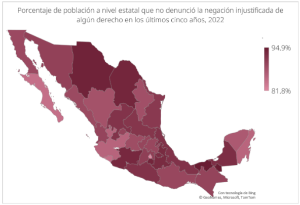 La ENADIS 2022 señala que, el porcentaje de la población a nivel estatal que no denunció la negación injustificada de algún derecho en los últimos cinco años fue del 90%. Las entidades con los porcentajes más altos de personas que no presentaron denuncia son: Morelos (97.8%), Tabasco (94.9%), Chihuahua (94.1%), Coahuila (93.7%) y Michoacán (93.1%).