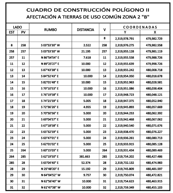 25. Que, la entonces Dirección General de Ordenamiento de la Propiedad Rural, hoy Dirección General de Resoluciones Presidenciales y Expropiaciones (DGRPE) de la Sedatu, el 26 de agosto de 2024, emitió acuerdo de instauración del procedimiento de expropiación con número de expediente DGOPR-DCE-DE/SOE-23QR/0159FONATUR TREN MAYA, S.A. DE C.V. y TREN MAYA, S.A. DE C.V/2024; 26. Que el comisionado técnico del RAN y el comisionado agrario de la Sedatu rindieron el "informe de comisión de Trabajos Técnicos e Informativos de Expropiación", de 25 de septiembre de 2024, en el que señalan que la superficie real a expropiar al ejido "Leona Vicario", municipio de Puerto Morelos, estado de Quintana Roo es de 01-60-57 hectáreas de uso común, que se describen en los siguientes planos y cuadros de construcción: