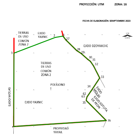 9. Que, el comisionado técnico del RAN y el comisionado agrario de la Sedatu, rindieron el "informe de comisión de Trabajos Técnicos e Informativos de Expropiación", de 26 de septiembre del 2023, en el que se señala que la superficie real a expropiar al ejido "Yaxnic", municipio de Mérida, estado de Yucatán, es de 495-00-00 hectáreas de temporal de uso común, que se describe en el siguiente plano y cuadro de construcción: