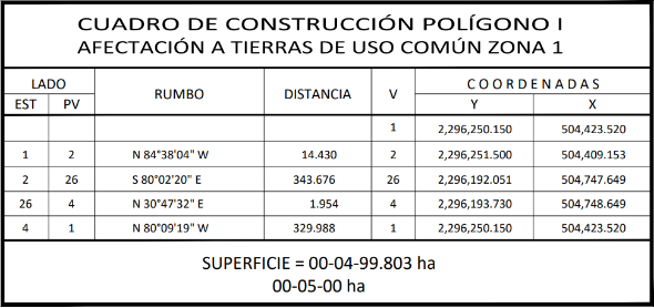 25. Que, el comisionado técnico del RAN y el comisionado agrario de la Sedatu rindieron el "informe de comisión de Trabajos Técnicos e Informativos de Expropiación", de 20 de agosto de 2024, en el que se señala que la superficie real a expropiar al ejido "Libre Unión", municipio de Yaxcabá, estado de Yucatán, es de 00-05-00 hectáreas de temporal de uso común, que se describen en los siguientes planos y cuadro de construcción: