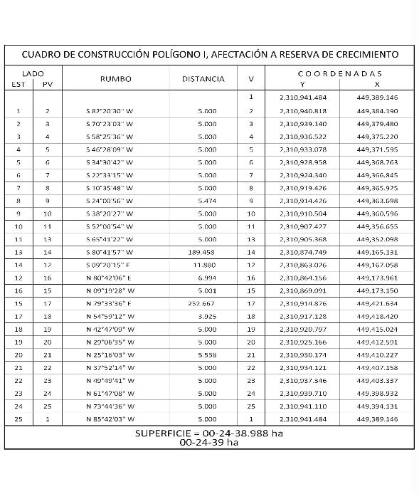 24. Que, el comisionado técnico del RAN y el comisionado agrario de la Sedatu rindieron el "informe de comisión de Trabajos Técnicos e Informativos de Expropiación", de 22 de agosto de 2024, en el que se señala que la superficie real a expropiar al ejido "El Tintal y su anexo El Pocito", municipio de Lázaro Cárdenas, estado de Quintana Roo, es de 00-24-39 hectáreas, que se describe en el siguiente plano y cuadros de construcción: