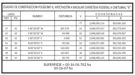 | 2. | A Bacalar carretera federal a Chetumal "B" | Temporal | 00-16-07 |