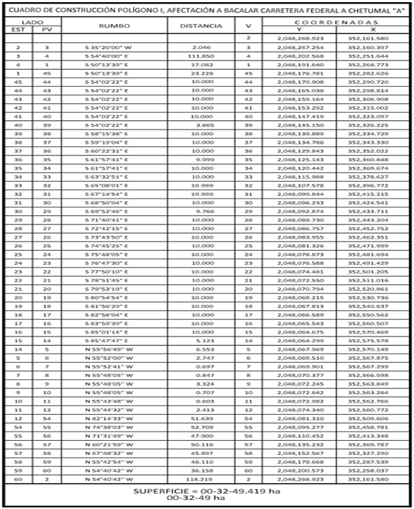 | 1. | A Bacalar carretera federal a Chetumal "A" | Temporal | 00-32-49 |