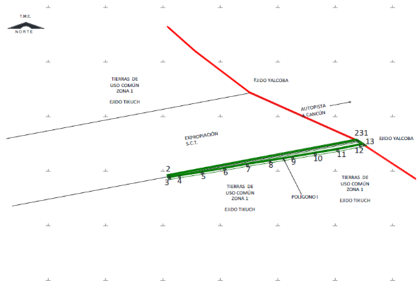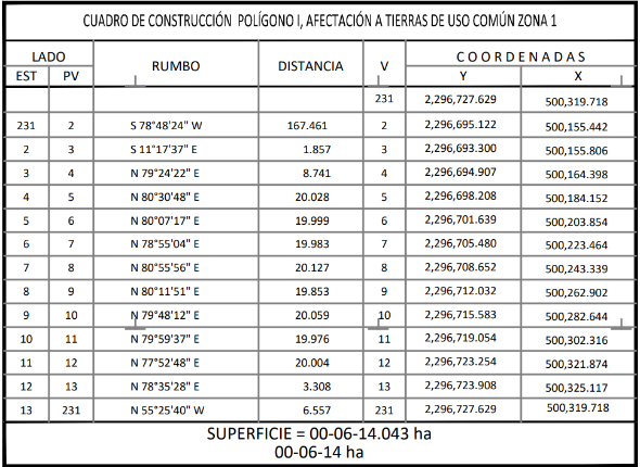 24. Que el comisionado técnico del RAN y el comisionado agrario de la Sedatu rindieron el "informe de comisión de Trabajos Técnicos e Informativos de Expropiación", de 11 de junio de 2024, en el que se señala que la superficie real a expropiar al ejido "Tikuch", municipio de Valladolid, estado de Yucatán, es de 00-06-14 hectáreas de temporal de uso común, que se describe en el siguiente plano y cuadro de construcción:
