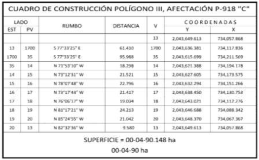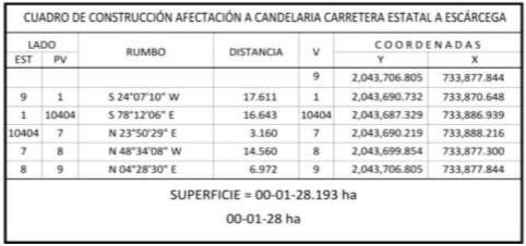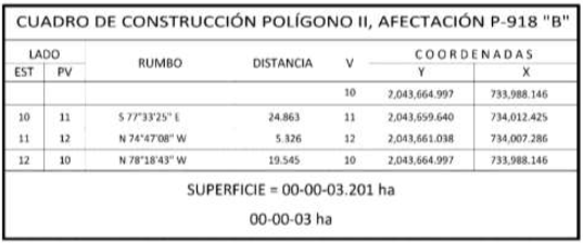 25. Que el comisionado técnico del RAN y el comisionado agrario de la Sedatu rindieron el "informe de comisión de Trabajos Técnicos e Informativos de Expropiación", de 22 de agosto de 2024, en el que señalan que la superficie real a expropiar al ejido "NCPA. Div. del Norte y sus Anexos", municipio de Escárcega, estado de Campeche, es de 00-45-90 hectáreas, de las cuales 00-01-28 hectáreas son de temporal de uso común y 00-44-62 hectáreas son de temporal de uso parcelado, que se describen en los siguientes planos y cuadros de construcción: