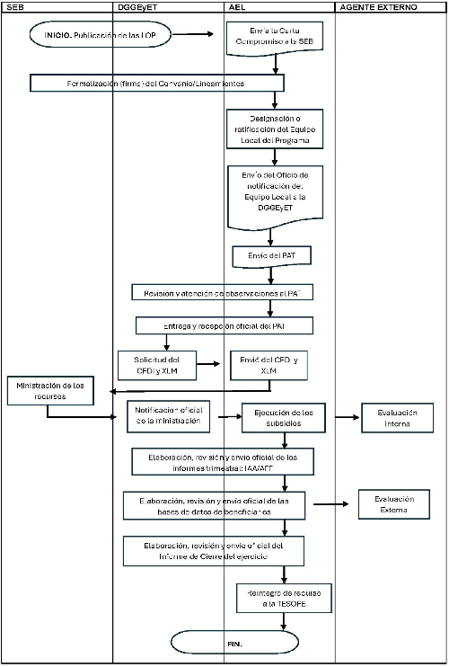 | Evaluación | Realizar la Evaluación Interna de desempeño del Programa establecido en las presentes Lineamientos de Operación y los criterios generales que la DGGEyET establezca. |