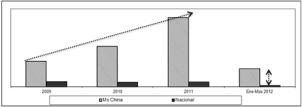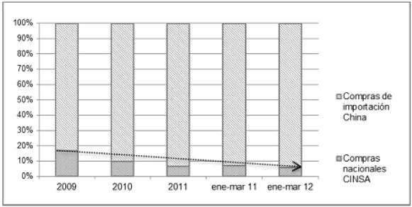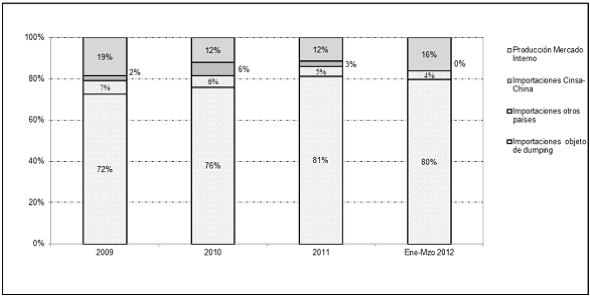 b. El crecimiento a favor de las importaciones llevó a que el producto nacional perdiera participación en las compras de dichos clientes del 17% en 2009, al 10%, 7% y 6% en 2010, 2011 y el primer trimestre de 2012, respectivamente. Véase Gráfica 8.