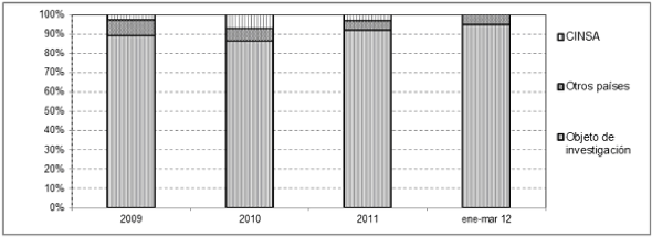 390. En relación con el CNA, la producción nacional disminuyó su participación en el periodo analizado, al pasar de 19% en 2009 al 12% en 2010 y se mantuvo sin cambio en 2011. En el primer trimestre de 2012 muestra una recuperación al ubicarse en 16%. Si bien existe un aumento de 3 puntos porcentuales con relación al primer trimestre de 2010 en donde se ubicó en 13%, con respecto a 2009 se observa una pérdida de 3 puntos.