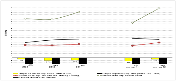395. De lo descrito en los puntos anteriores, la Secretaría consideró de manera preliminar que la pérdida de participación de la producción nacional en el periodo de 2009 a 2011 se explica en mayor medida por las importaciones investigadas. La misma observación aplica para el primer trimestre de 2012.