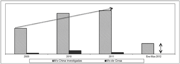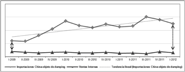 401. Las ventas al mercado interno disminuyeron 7% y 8% en 2010 y 2011. En el primer trimestre de 2012 en relación al mismo trimestre de 2011 aumentaron 17% pero en relación a 2010 presentan una reducción de 11%. Como se observa en la Gráfica 6, existe una diferencia importante entre las importaciones investigadas y las ventas internas, diferencia que se fue ampliando hacia el final del periodo analizado. En el primer trimestre de 2009 las importaciones investigadas se ubicaban dos veces por arriba de las ventas internas, hacia el primer trimestre de 2012, la brecha es prácticamente de 7 veces sobre las ventas internas. Véase Gráfica 7.