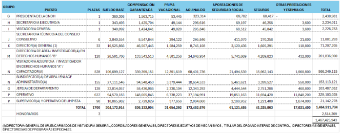 Al 15 de febrero de 2026 del total de la plantilla se cuenta con 266 plazas vacantes. La estructura de grupos, grados y niveles se desagrega en el Manual de Percepciones de las y los Servidores Públicos de la Comisión Nacional de los Derechos Humanos para el año 2026. Conforme a las disposiciones aplicables las cifras contenidas en el cuadro están sujetas a la modificación de las remuneraciones que, en su caso, se otorguen a las personas servidoras públicas durante el ejercicio fiscal 2026.