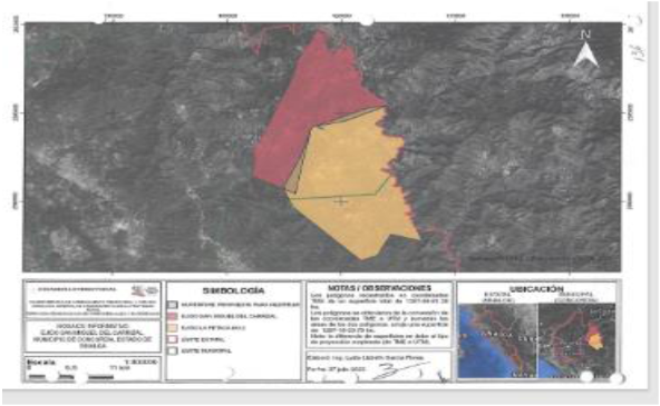 "El predio investigado tiene una superficie aproximada de 50,700-00-00 Hs. de agostadero cerril su vegetación está compuesta en su mayoría de pinos y palo colorado; al ser investigada en la Oficinas de catastro y Registro Público se encontró que no existe registro del predio, al ser revisada la relación de terrenos Nacionales que obra en poder de la Delegación del Departamento de Asuntos Agrarios, se encontró que viene considerado como baldío.