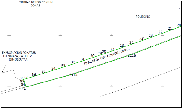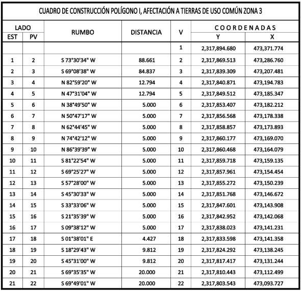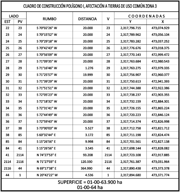 25. Que, el comisionado técnico del RAN y el comisionado agrario de la Sedatu rindieron el "informe de comisión de Trabajos Técnicos e Informativos de Expropiación", de 14 de noviembre de 2024, en el que se señala que la superficie real a expropiar al ejido "Leona Vicario", municipio de Puerto Morelos, estado de Quintana Roo, es de 01-00-64 hectáreas de temporal de uso común, que se describen en los siguientes planos y cuadros de construcción: