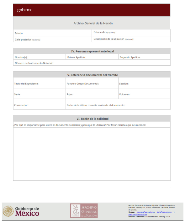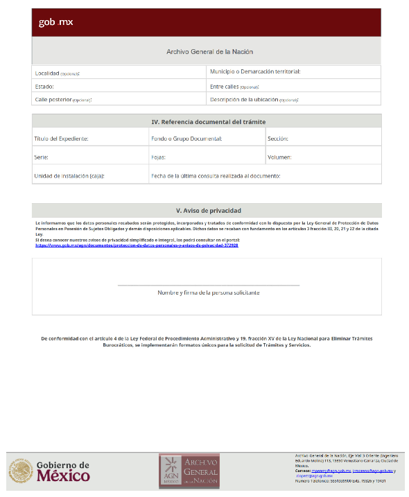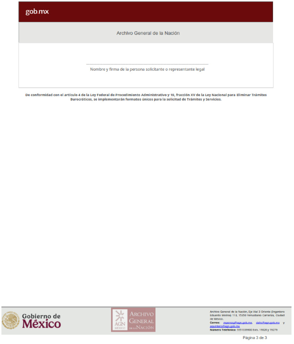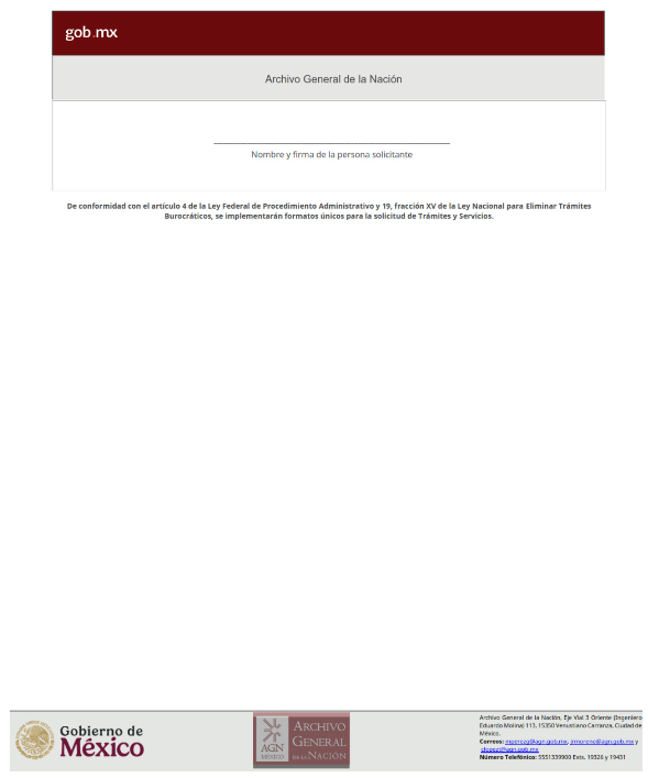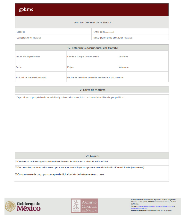 | 3 | AGN-2026-001 | Autorización del uso del contenido del patrimonio documental | El siguiente requisito será incorporado al formato de solicitud: 1. Carta de motivos, donde especifique el propósito de la solicitud | 1. Formato de solicitud. 2. Credencial de investigador del Archivo General de la Nación o identificación oficial. En su caso: 3. Documento que lo acredita como persona apoderada legal o representante de la institución solicitante 4. Comprobante de pago por concepto de digitalización de imágenes. |