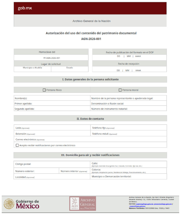 | 1 | Autorización del uso del contenido del patrimonio documental | Sin homoclave | AGN-2026-001 |