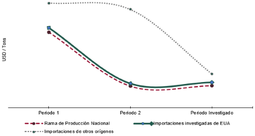 c. Los precios de las importaciones del producto objeto de investigación mostraron un comportamiento decreciente con una caída del 49% en el periodo analizado, situación que se reflejó en una depresión del precio de venta al mercado interno de la rama de producción nacional del 50% para no perder participación de mercado, pues la industria nacional actuó como tomadora o seguidora de los precios de las importaciones objeto de investigación. La caída en precios de las importaciones originarias de los Estados Unidos constituye un factor que explica sus volúmenes crecientes y su participación en el mercado nacional, desplazando a la producción nacional y ventas al mercado interno.
