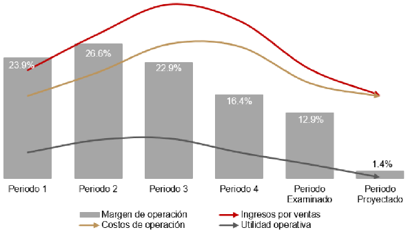 182. En cuanto al margen operativo, este incrementó 17 puntos porcentuales en el periodo 2, pero disminuyó de 6.3 puntos porcentuales en el periodo 3 y 17.1 puntos porcentuales en el periodo 4, e incrementó 9.4 puntos porcentuales en el periodo examinado, lo que reflejó un incremento de 3 puntos porcentuales en el periodo analizado, al pasar de un margen de 18.5% en el periodo 1 a 21.5% en el periodo examinado.