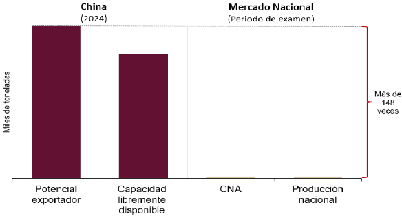 b. El potencial exportador de China (capacidad instalada menos consumo) creció 4% en 2024, dicho indicador equivale a más de 150 veces el tamaño del mercado nacional y más de 140 veces la producción nacional en el periodo de examen, lo que confirma que China desempeña un papel protagónico en el comercio internacional, respaldado por su considerable potencial exportador, así como las condiciones de discriminación de precios en las que suele incurrir, por lo que desplazaría del mercado a la producción nacional.