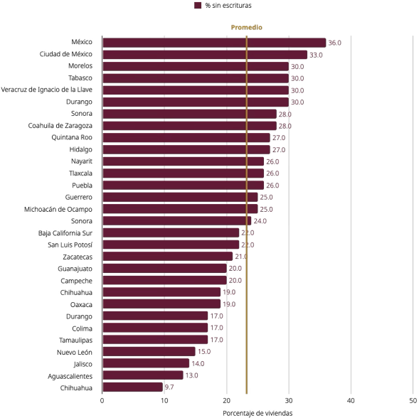 Nota: En 2022, más de una cuarta parte de las viviendas propias o en proceso de pago carecían de escrituras en 19 entidades, destacando Chiapas (36 %), Oaxaca (33 %) y Guerrero (30 %) como los casos más críticos. Esta inseguridad jurídica en la tenencia de la tierra afecta la inclusión financiera, la formalización del suelo y la garantía del derecho a la vivienda adecuada. Se promoverá una estrategia de regularización con enfoque territorial, de género e intercultural, articulada con el acceso a servicios, mecanismos de titulación masiva y fortalecimiento institucional del sector agrario y urbano.