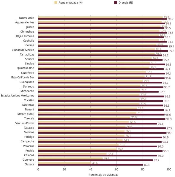 Nota: Se incluye el valor correspondiente a "Estados Unidos Mexicanos", el cual representa el agregado nacional estimado conforme al diseño metodológico del INEGI (suma o ponderación según el indicador) y se incorpora como referencia para la comparación territorial. Aunque en la mayoría de las entidades federativas más de 90 % de las viviendas cuentan con acceso a drenaje, el acceso efectivo a agua potable muestra rezagos críticos en estados como Chiapas (40.6 %), Guerrero (49.4 %) y Oaxaca (52.4 %). Esta disparidad evidencia brechas territoriales persistentes en infraestructura básica y servicios esenciales, especialmente en regiones del sur-sureste. Se deberá plantear estrategias de desarrollo territorial equitativo que priorice inversiones en infraestructura hídrica y saneamiento en municipios con mayor rezago, en articulación con los derechos sociales, y la justicia territorial.