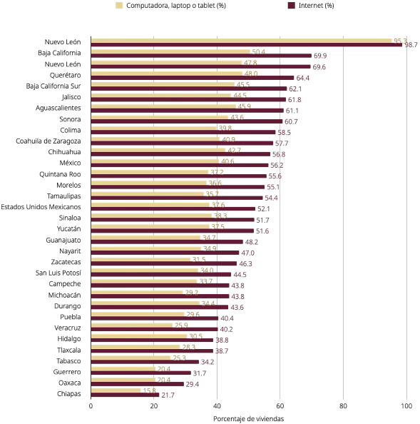 Nota: Se incluye el valor correspondiente a "Estados Unidos Mexicanos", el cual representa el agregado nacional estimado conforme al diseño metodológico del INEGI (suma o ponderación según el indicador) y se incorpora como referencia para la comparación territorial. El acceso a internet y a dispositivos digitales presenta una de las brechas más marcadas del rezago territorial en México: mientras que entidades como Ciudad de México y Nuevo León superan 60% de cobertura digital en hogares, estados como Chiapas, Oaxaca y Guerrero se ubican por debajo del 25%. Esta desigualdad territorial en la conectividad limita el acceso equitativo a derechos fundamentales como la educación, la salud, el trabajo y la participación ciudadana. Se debe incorporar la dimensión de conectividad digital como infraestructura habilitante clave, priorizando inversiones estratégicas en municipios con bajo acceso a tecnologías de la información, en coherencia con el principio de justicia digital.