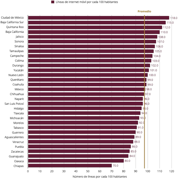 Nota: La conectividad móvil refleja disparidades regionales significativas: mientras entidades como Ciudad de México, Baja California Sur y Nuevo León presentan niveles por encima de 110 líneas por cada 100 habitantes, estados como Oaxaca, Chiapas y Guerrero registran niveles cercanos o inferiores a 85. Esta brecha digital impacta directamente la inclusión territorial, el acceso equitativo a servicios en línea y el derecho a la información. Se debe considerar la conectividad digital como parte esencial de la infraestructura habilitante para el desarrollo regional y la justicia territorial, priorizando intervenciones que articulen despliegue de infraestructura, asequibilidad y alfabetización digital en zonas rurales, periurbanas e indígenas.