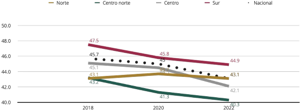 6 Más información, ver: Cuadro 20. Composición del PIB por tipo de actividad económica. Cifras desestacionalizadas en millones de pesos constantes de 2018. Cuarto trimestre de 2024; Cuadro 21. Participación estatal en el PIB nacional por sector económico (2023); Cuadro 22. Población de 15 años y más por condición de actividad económica, ocupación y disponibilidad para trabajar, según sexo. Valores absolutos (enero de 2024 y 2025); Cuadro 23. Evolución de la dispersión salarial por región (2014-2023); Cuadro 24. Evolución del índice de Gini por región (2018-2022); Gráfico 02. Evolución del índice de Gini como medida de desigualdad del ingreso (2018-2022).